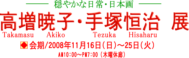 日展会員 高増先生は房総の風光をこよなく愛し、独自の画風を確立、 同じく会員の手塚先生は人物や静物画の背景の色面構成を追求して おられます。お二人の淡く優しい色調の作品は、なんとも暖かく、穏や かな日常を感じさせます。深まりゆく秋の一日、どうぞご高覧下さい。