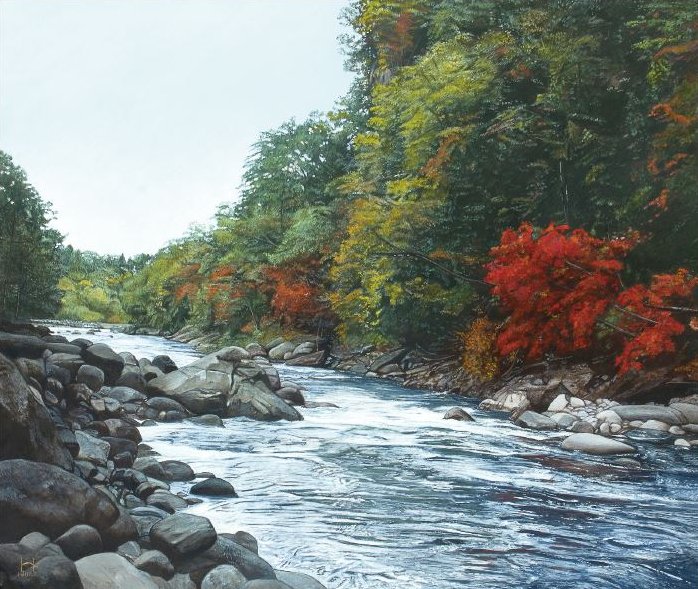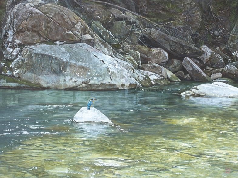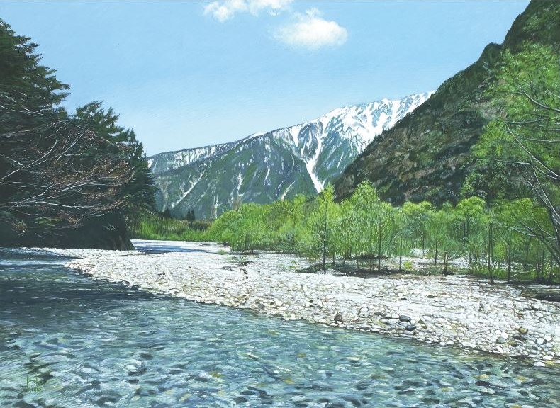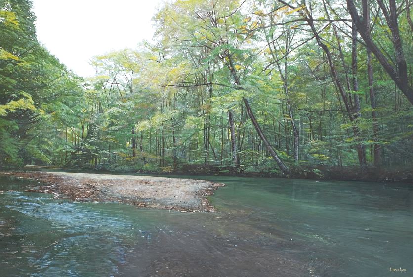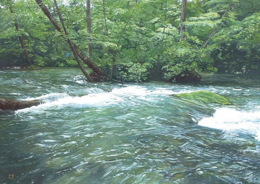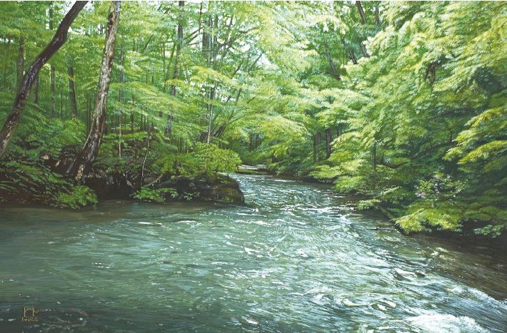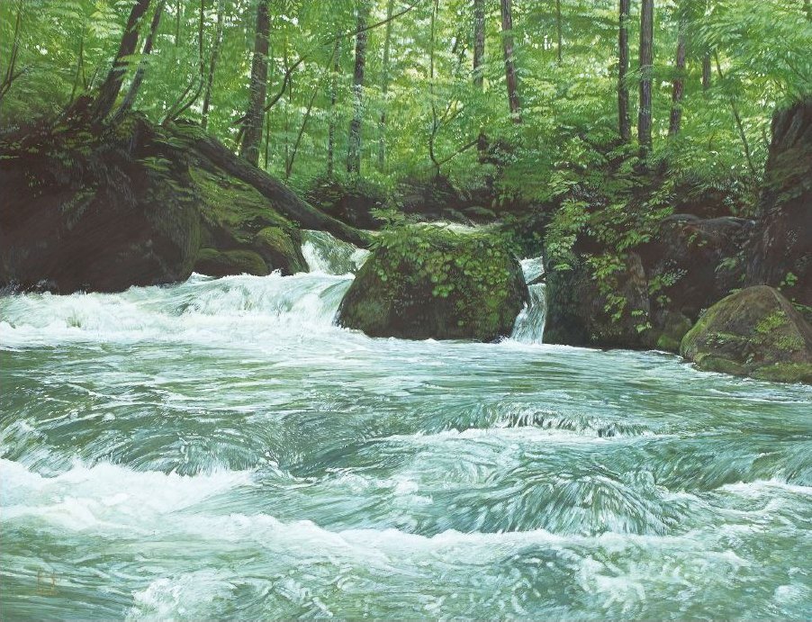 テンペラ技法特有の瑞々しい絵肌で、水底の見える浅瀬や、滔々と流れ、また岩をはむ激流など、千変万化の水の姿を余すところなく表現する卓越した表現力は多くの人々を魅了しています。水の画家と云われる所以です。居島さんは森の囁きに耳を澄ませ、水と対話し乍ら描きます。それは自然に対する畏敬の念と憧憬がなせるものであろうか。風景画の醍醐味をご堪能頂ける展覧会です。